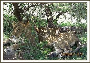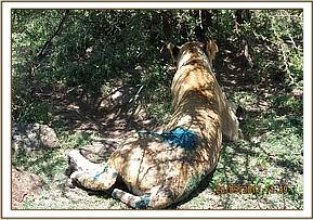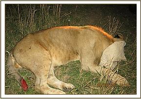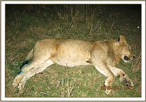 This lioness was found under a shade with wounds on both of her flanks. She had difficulty rising.
