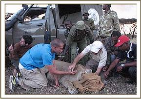 Collaring of a lioness in Naiboshio conservancy in Masai Mara.
