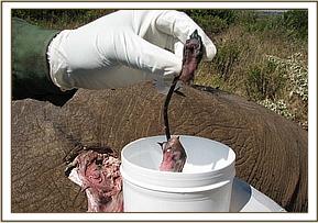 The elephant carcass was sighted two days after death, it was an adult male elephant whose cause of death was not known. Postmortem examination revealed an arrow wound on the right abdomen, the arrow-head was still stuck on the abdomen. The arrow punctured part of the colon resulting into leakage of intestinal contents into the peritoneum. This caused generalized peritonitis caused by the traumatic injury by the arrow and leakage of intestinal contents. The arrow caused severe myonecrosis and peritonitis which could have led to septiceamia and death.