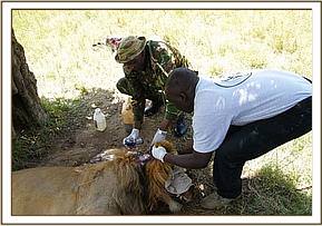 The lion was examined and found to be under stable anaesthesia, the snare had created a deep wound through the neck muscles and was getting infected. The snare had earlier dropped off and could not be seen. The wound was already infected and could not be sutured due to sepsis, it was therefore cleaned and debrided using 10% hydrogen peroxide followed by application of tincture of iodine and cloxacillin ointment. It was further treated by Betamox antibiotic and dexamethasone administered intramuscularly. Blood and tissue samples were collected for laboratory analysis.