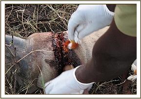 The animal was darted on the left shoulder and the drug took effect after a few minutes then it was assisted to become recumbent by roping. The hoof was then trimmed using a hacksaw and the wounded corium treated by tincture of iodine. Antibiotic drug was also administered parenterally through intramuscular route. The animal was then revived from anaesthesia and joined others, the chances of recovery are good.
