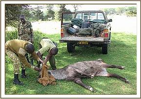 The animal was in a tightly fenced area with a lot of thick vegetation and it was not even easy to locate it for capture. It took us a long time before finding it. When we finally found it we decided to immobilize it and use the pick –up for transport. The animal was then followed on foot and darted using Palmer Cap-chur dart gun just as it was attempting to take off. The drugs used for immobilization was 7mgs of etorphine hydrochloride combined with 20mgs of xylazine hydrochloride. It took about 6 minutes to become recumbent. It was quickly loaded onto the pick-up and driven to KWS Annex Sanctuary about 3Kms away then revived from anaesthesia and left to join others.
