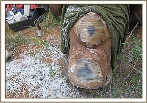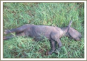 Evidence of struggle in the immediate vicinity of the carcass. Carcass was lying on right lateral recumbency with its external ears, preputial area, mandibular lip and palpebrae bitten off by scavengers. The lower abdomen and perineum was infested by second generation maggots which suggest the carcass was at least 72 hours old.
