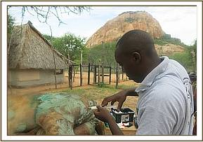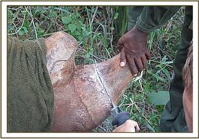 A combination of Etorphine Hcl (M99) 6mg and Azaperone Hcl 80mg in a single 3cc DanInject dart was employed. Because of dense bush and difficult terrain the animals were darted on foot with directions provided by a spotter at an observation point located on a hill top. A fixed wing airplane monitored darted animals and guided the ground team to the animal through radio communication.