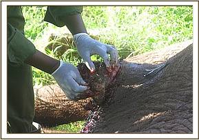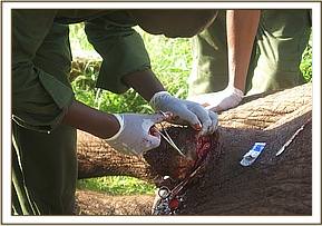The Meru MVU responded immediately and began searching the affected individual. Because of the rainy season there were several herds of elephants in the park hence the search lasted several hours. However, we were lucky to find it late in the evening. The animal was immobilized for examination and treatment.