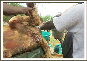 Both horns (front and rear) were removed for safekeeping by the Warden Isiolo Penetrating wound caused by a sharp object into the left middle thoracic area caudal to the 10th rib. The wound measured approximately 5 cm wide and penetrated through the intercostal space into the thoracic cavity. On opening the carcass, evidence of internal hemorrhage with blood clot in the ventral thoracic cavity. Internal organs were extensively autolysed.