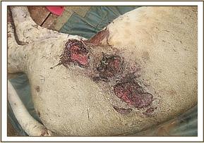Treatment: Thorough wash of the wounds with soap and water; wound debridement; green clay applied and topical antibiotic spray Amoxicillin trihydrate injection 3000mg administered intramuscularly 0.1% Dexamethasone Hcl 10mg intramuscularly Injection Ivermectin 2ml subcutaneously To review after 48 hours