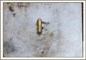 - General carcass examination: Animal showed good body condition. Carcass was found lying on left lateral recumbency with both horns excised. A single penetrating wound was found cranial to the scapula of the right forelimb.