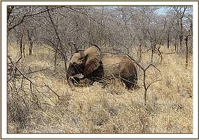 The injured elephant was located in a herd of 12 elephants in a thicket near the Murera river. We waited for a few minutes for the herd to move to an open area for darting. Etorphine Hcl 3mg was used to immobilize this animal that fell onto left lateral recumbency after 3 minutes. The herd was then driven away by a vehicle. Examination showed an expansive degloving wound suspected to have been caused in a predator attack by lions. This was an old wound showing early signs of healing. The wound was cleaned with water and soap and povidone iodine was applied. Green clay was also applied. Betamox trihydrate 30 milliliter was injected intramuscularly to prevent overwhelming systemic infection.