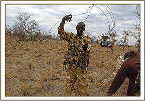It was immobilized to remove the snare on the 8th of August. The giraffe was found in a group of 8 animals which looked agitated when approached by vehicle. To immobilize the giraffe we used a combination of Etorphine Hcl 12mg and Xylazine Hcl 40mg in a single 1.5 cc DanInject dart. Darting was done from the vehicle after a brief chase. Ten minutes after darting it was roped down to lateral recumbency.
