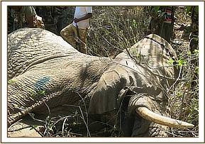 Immobilization was achieved using 20mg Etorphine in a single 3cc Dan-inject dart from foot with the dart placed into the gluteal muscles. The elephant went down in 12 minutes with the elephant lying on sternal recumbency. He was tipped to right lateral recumbency to enable examination.