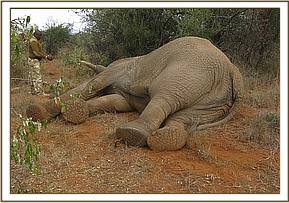 Physical examination showed that this elephant was emaciated; however, no external injury was seen despite reports of lameness by scouts. Emaciation was suspected to have been caused by an internal disease process.
