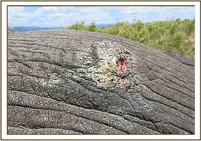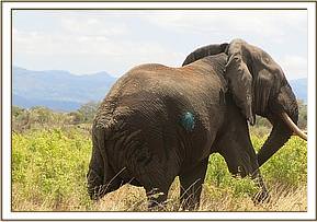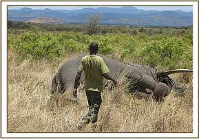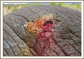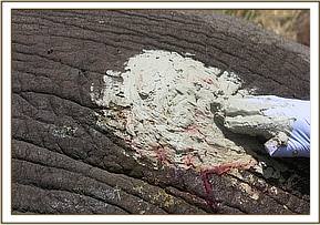 This elephant was found during a patrol in the park. It had pus oozing from a swelling in the abdominal flank. This elephant was darted for examination and treatment.