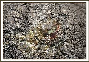 Examination showed an open abscess. Debridement of the abscess was carried out to remove pus and necrotic tissue using hydrogen peroxide and iodine. Green clay was then applied and a systemic antibiotic was injected to prevent spread of infection.
