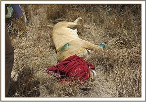 A female lion in Lewa conservancy was immobilized to remove a tracking collar which had malfunctioned. The lioness was also treated for lameness on its right forelimb.