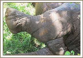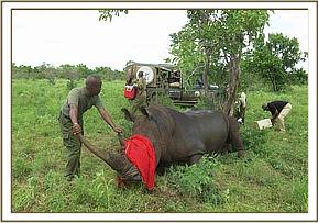 The rhino was immobilized using a combination of M99 5mg and Stressnil® 60mg in a single 3cc Dan-Inject dart with a 2.0 × 60mm needle from a helicopter. The dart was placed into the dorsal lumbar muscles. This rhino was roped to lateral recumbency after 9 minutes and a blind fold applied to minimize stress.