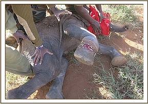 Darting was done from a vehicle using 12mg M99 in a 1.5cc Dan-Inject dart. The rest of the herd was chased away using vehicles and the calf roped to lateral recumbency for treatment.
