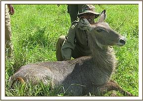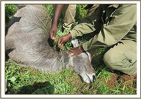 The waterbuck was immobilized using a combination of M99 3mg and Stressnil 20mg in a single 1.5cc Dan-Inject dart from a vehicle. It went down in five minutes and a blind fold was applied to minimize stress.