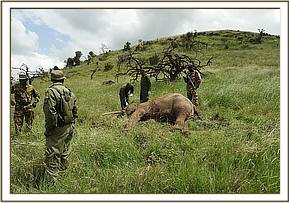 We found this elephant alone in an open grassland plain which is ideal for vehicle darting. For immobilization we used Etorphine hydrochloride 10mg in a 1.5 cc dart injected into the gluteal muscles. Induction time was four minutes and the elephant fell into right lateral recumbence.