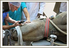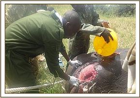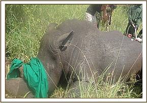We used a combination of Etorphine Hcl (M99) 6mg and Xylazine Hcl 80mg in a 3ml Dan Inject dart with a 2.2 60mm needle. Darting was conducted on foot since the rhino was used to rangers moving around. The dart was placed on the right forelimb at the brachial muscles. Induction time was 25 minutes during which time the animal covered about 3 kilometers. The animal was then roped to sternal recumbency after chasing the calf with a vehicle. On contact with the animal, copious amount of water was doused to cool the animal. Opticlox ointment was applied on the dart wound and eyes to prevent desiccation of the cornea. Vital parameters such as respiration and tissue perfusion were continuously monitored to ensure that the narcotized animal was stable. After the procedure, Naltrexone 150mg and Atipamezole 10mg were administered intravenously into the superficial ear veins to reverse the effects of the opioid and the α-2 agonist. Diprenophine Hcl 24mg was also administered intramuscularly to prevent renarcotization. Physical examination and diagnosis