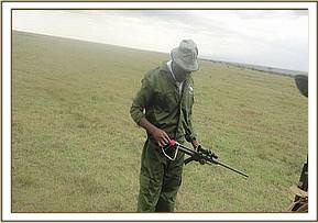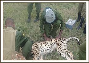 We used Etorphine Hcl 7mg and Xylazine 80mg in a 3cc Dan-Inject dart with a 2.0 40 mm needle. Darting was conducted by vehicle after a brief chase. The dart was placed caudally on the left flank. Induction time (down time) was 8 minutes. On contact with the animal, opticlox ointment was applied on the dart wound and eyes to prevent desiccation of the cornea. Vital parameters such as respiration and tissue perfusion were continuously monitored to ensure that the narcotized animal was stable. After the procedure, Diprenophine 24 mg and Atipamezole 15mg were administered intravenously into the jugular vein to reverse the effects of etorphine and xylazine respectively.