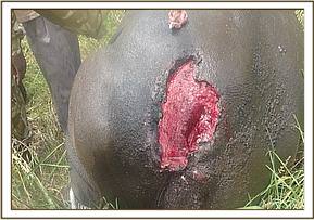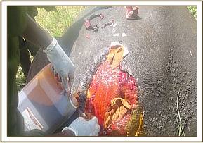 A rhino carcass with its horns intact was found near a water hole in Aberdare national park and a request was put to the Meru MVU for a post mortem examination to determine the cause of death. The carcass had been extensively consumed by hyenas therefore the viscera, gluteal and rectal parts were missing. Methods used included flaying, incising and sectioning.