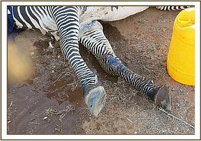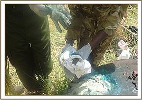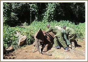 We used Etorphine Hcl 12mg in a 1.5 milliliter DanInject dart with a 2.2 60mm needle. Due to thick bush and bad terrain for vehicles in Marsabit NP darting was conducted on foot. The dart was placed on the left rump with the animal going down after 5 minutes. On contact with the animal its trunk was extended and nostrils were kept patent to prevent obstruction of the airways. A blindfold was used to prevent visual stimulation. The animal was in poor body indicating that it was a long standing case. It had a swelling on the distal part of the right hind limb at the tarsus extending to the hoof. No significant findings (no foreign body nor pus) after thoroughly washing of the hoof with soap and water and aspiration. Fracture of the tarsal bones was suspected which though rare may occur.