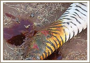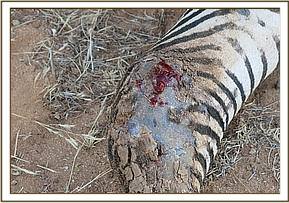 An expansive wound dorsally on the left hind quarters about 25 cm 15 cm in diameter extending caudally to the base of the tail. The lesion was superficial affecting only the epidermis characterized by redness, erosive ulceration and crust formation. The edges of the lesion were serrated, necrotized with a foul smell and the skin around it undermined with pockets of blood. These observations are characteristic of cutaneous filariasis thought to be caused by Stephanofiria dinniki in white rhino. The wounds are exacerbated ox pecker birds and bacterial infection.