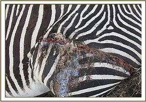Carcass was found on right lateral recumbency with little evidence of struggle at the scene. Carcass inspection revealed old scars on the skin dorsally along the thoracic vertebrae. No other injuries were seen.
