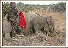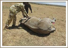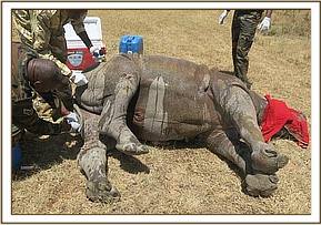 The rhino was immobilized using a combination of 1mg Etorphine Hydrochloride and 20mg Xylazine Hydrochloride in a single 1.5cc Dan-Inject dart from a vehicle. The dart was inserted into the gluteal muscles and the rhino was recumbent after 4 minutes with its mother guarding close by. The mother was pushed away using a vehicle and the calf quickly given 40mg Butorphanol Tartate intravenously to improve respiration.