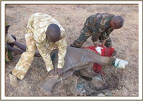 This snared elephant was reported by the Ngorare ranch manager who requested for its treatment through the KWS warden at Eland Downs.