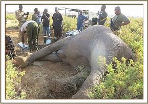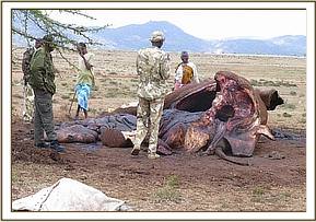 This elephant carcass was reported by KWS rangers on patrol, through their company commander in Meru NP, who requested for a post mortem to determine the cause of death.