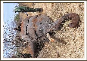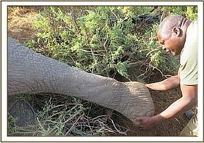 The elephant was immobilized with 16mg Etorphine Hydrochloride in a 3cc Dan Inject dart with from a vehicle. The dart was placed into the left gluteal muscles and within 6 minutes the elephant fell onto right lateral recumbency.