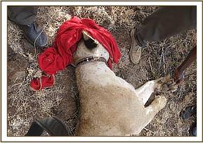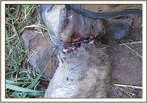 This emaciated hyena was found by MNP rangers on patrol with a strangling snare around the neck. The rangers requested emergency veterinary intervention because the hyena was recumbent and showed difficulty breathing. Despite immediate response from the Veterinary Team the hyena died a few minutes later. It had a tight wire snare around the neck which had cut through skin and was embedded in the skeletal muscle tissue causing deep wounds, esophageal and tracheal stenosis with subsequent dysphagia and asphyxiation.