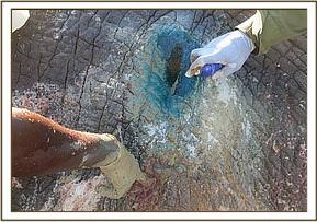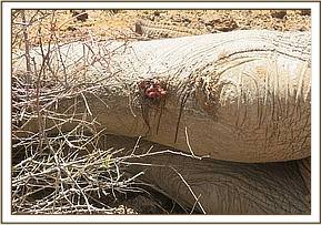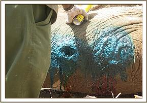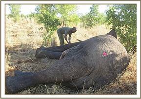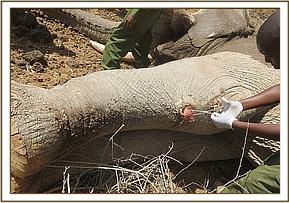 On 16/02/17 at 1430 hours, with the assistance of tour drivers, the team tracked the sick elephant to a rocky area near the lodge. It was darted for treatment when it moved to a plain grassland terrain.