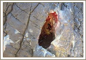 Examination showed an abscess on the left ventral abdominal wall exuding pus through a sinus tract opening dorsally. Necrotic tissue was hanging from the opening. The vet was unable to determine the cause of this injury.