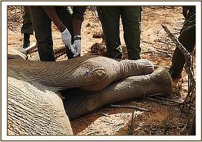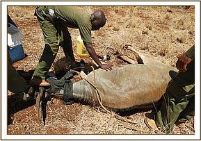 The elephant was immobilized using 12mg of Etorphine Hydrochloride and went down on lateral recumbency.