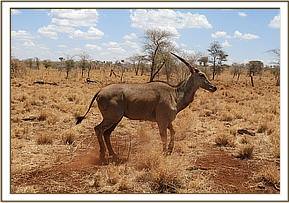 This eland was immobilized using 10mg of Etorphine Hydrochloride and 120mg of Azaperone tartarate combined in a 3ml Dan-Inject intramuscular dart. It went down on sternal recumbency before a blind fold was applied.