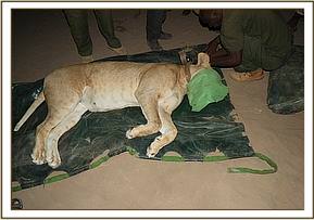 The lions were enticed at night using bait and call backs before being immobilized using 4mg of Medetomidine and 296 mg of Ketamine hcl combined in a 3ml Dan-Inject intramuscular dart. An additional dose of 150mg Ketamine hcl was administered intramuscularly to ensure safe transport of the lions to the site where the cages were located. One of the lionesses was fitted with a tracking collar.