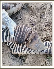 This zebra had a tight snare around its right hind leg proximal to the hoof. It was immobilized to remove the snare on 28 February 2018.