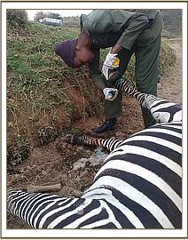 The zebra was darted using a combination of Etorphine and Azaperone in a 3 millimeter dart. It was darted from a vehicle after a brief chase. Down time was 5 minutes.