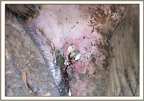 The dead tissue was debrided by washing with hydrogen peroxide and scrubbing followed by topical application of Iodine. Ivermectin 150mg was then injected subcutaneously as was 20% Alamycin LA 100ml intramuscularly.
