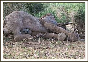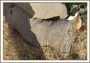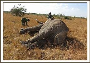 This elephant was euthanized by a single bullet into the cranium to prevent prolonged suffering. A post mortem showed a comminuted fracture of the humerus and the head of the scapula.