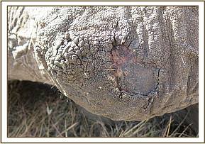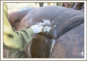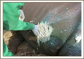 Rangers on patrol in the rhino sanctuary at MNP reported on the 24th January that this White rhino (Bahati) had wounds on the abdominal flank which required treatment. He had been treated 18 months earlier for ulcerative cutaneous filariasis which had recurred.