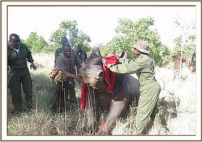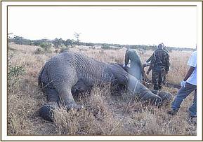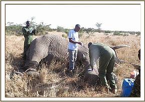 Darting was done from a helicopter provided by KWS. A combination of Etorphine hydrochloride 6mg and Xylazine hydrochloride 60mg in a single 1.5cc danInject dart was used. The dart was placed into the dorsal lumbar muscles and went down after 6 minutes.