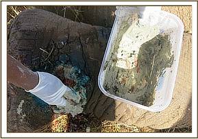 Examination showed infected penetrating wounds distal to the left carpal joint with crepitus felt on probing with a forceps suggesting a fracture in the bones of the carpal joint. The right forelimb was swollen distal to the carpal joint with a single penetrating wound. Injuries to this elephant were caused by gunshot.