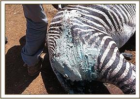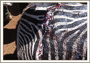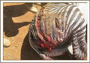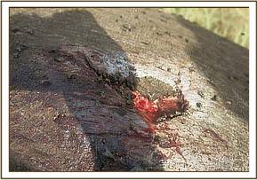 Examination showed deep puncture wounds into the dorsal lumbar muscles. There were also lacerations (upto 30cm in length) both left and right gluteus with loss of skin in some areas. These injuries are consistent with attempted predation.