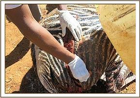 Genital examination showed a swollen penis and inflammation of the prepuce. No pus was found on aspiration. An infected penetrating bullet wound through the hard palate and the dorsal part of the trunk was observed.