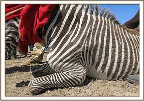 A complete cell (CBC) count of EDTA blood showed severe anemia. The fecal sample for helminth egg analysis could not be processed as it had not preserved properly. The zebra was given 7ml 1% Ivermectin subcutaneously and 15ml 20% Oxytetracycline intramuscularly.