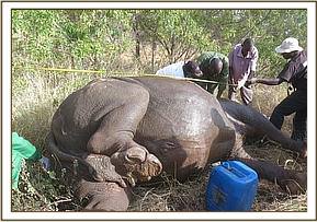 The rhino monitoring team in Meru national park reported that this rhino was in a fight with another bull two days earlier. It manifested wounds on various parts of the body and loss of its front horn which was later recovered by rangers on patrol. This rhino was immobilized to assess the extent of injuries and treatment on 26th January.
